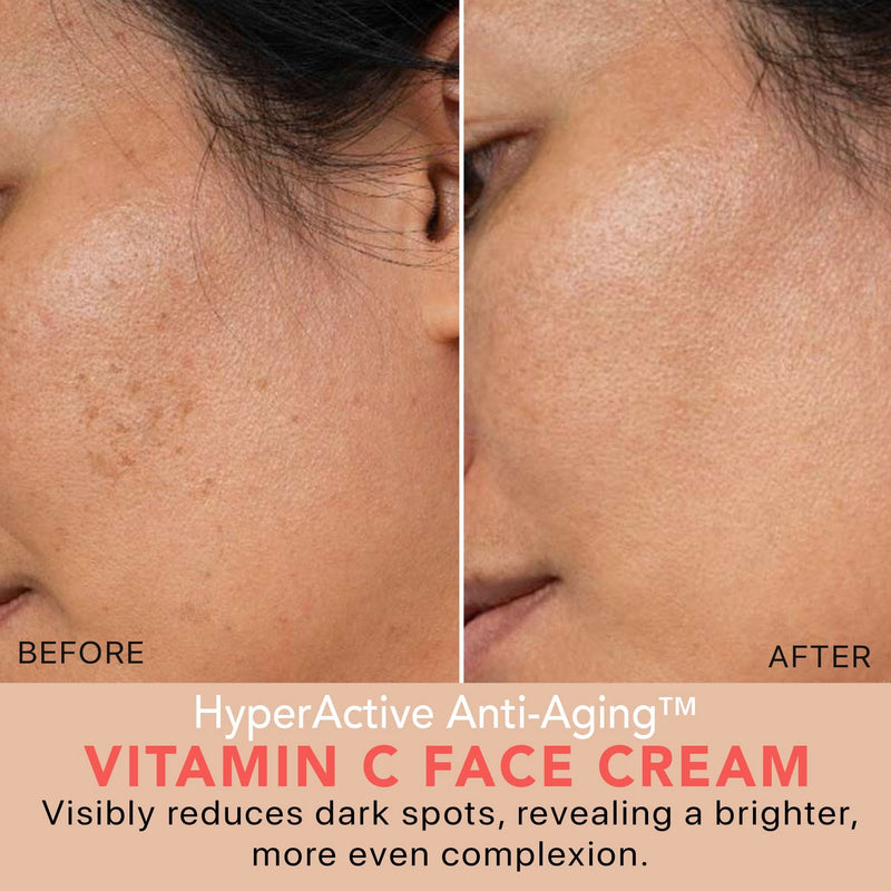 It will sink into your pores easily, without any greasy residue. Because really, who has time for that? We recommend massaging it into your face for a few seconds, and letting it sink in before moving on to your facial oil if you use one. If you’re a serum loving babe, we recommend applying it under your HyperActive Anti-Aging® Vitamin C cream for the best brightening results.