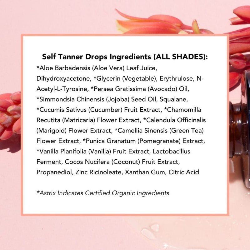 The active ingredient in our self tanner drops is DHA, a sugar derivative that gives the top layer of the skin a bronzed glow. Non-GMO and overflowing with plant-based goodness. It’s backed up by a carefully selected combination of supporting ingredients, including organic aloe vera leaf juice, organic avocado oil, and organic cucumber and matrcaria extract.