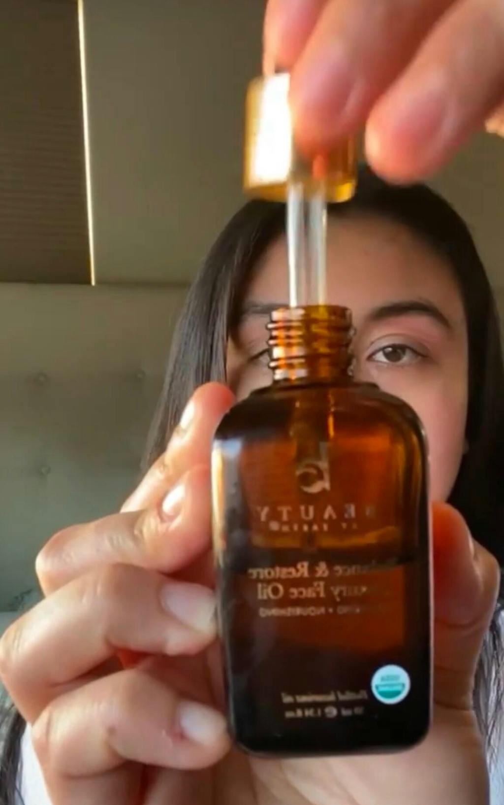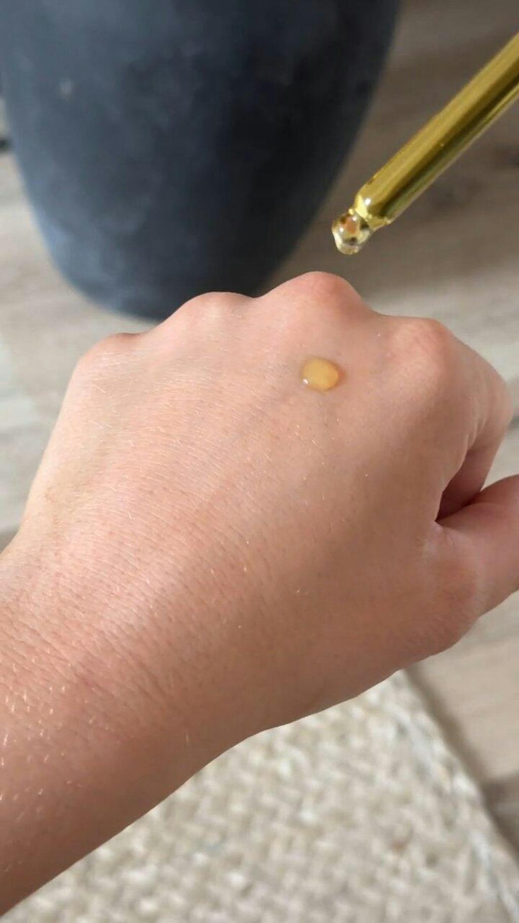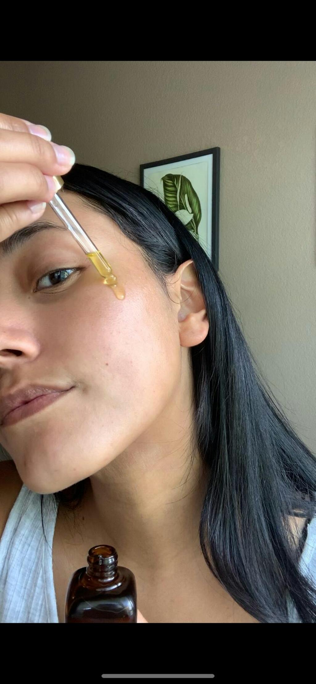 Drop a few drops of oil onto your open palm. A little goes a long way! Use your fingertips to transfer the oil onto your face, dotting it over your cheeks, jaw, and forehead.